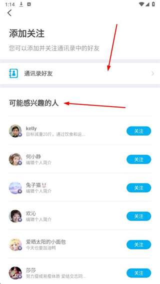 4、可選擇添加通訊錄好友或關(guān)注可能感興趣的人,完成好友添加。