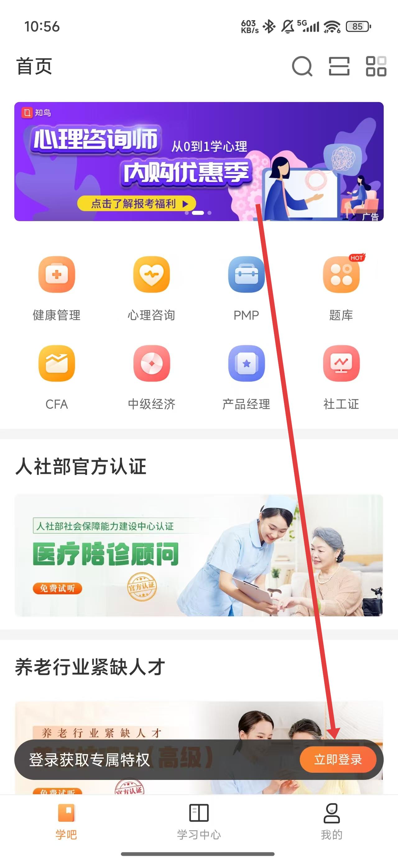 1、可以在知鳥app首頁中,點(diǎn)擊下方立即登錄按鈕,進(jìn)行登錄操作。