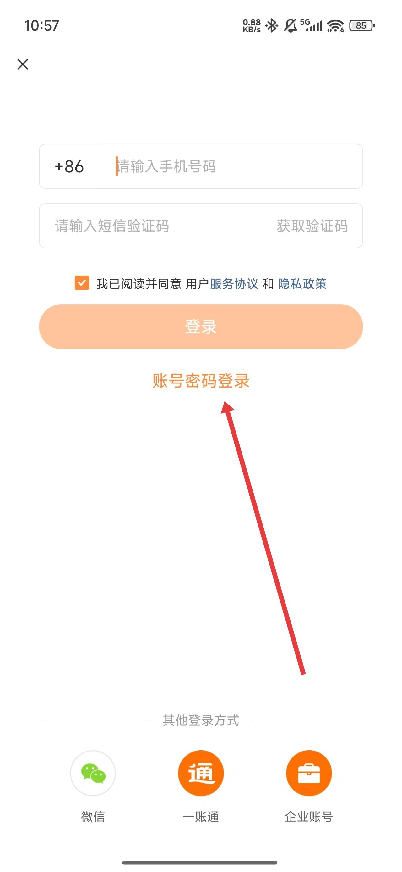 3、在驗(yàn)證碼登錄頁面中,可以點(diǎn)擊下方賬號(hào)密碼登錄按鈕,切換成使用密碼登錄。