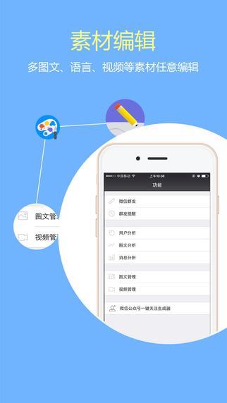 獨創(chuàng)圖文素材管理,與官方完全同步,預覽、新建、刪除、編輯,支持各種富文本標簽,移動終端編輯圖文不再是雞肋