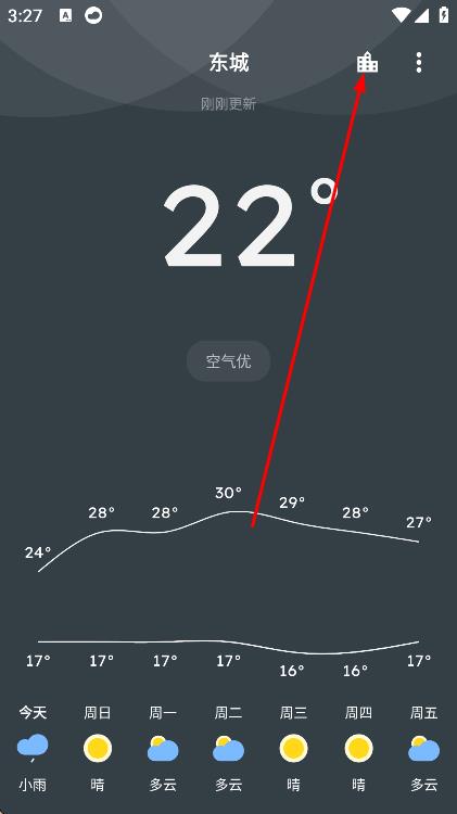 1、打開純天氣預報,點擊主界面右上角的圖標。