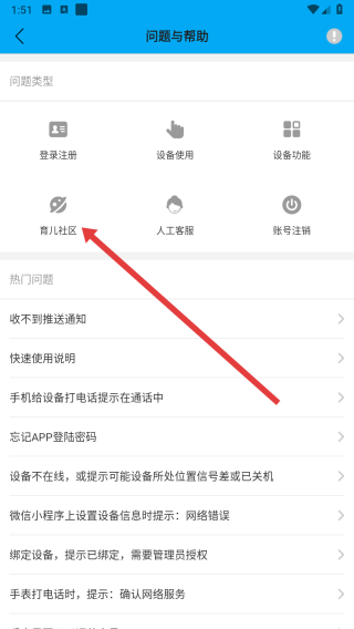 2、在進入到問題與幫助頁面中,可以點擊育兒社區(qū)選項進入查看。