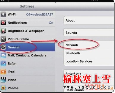 ad中進入設(shè)置菜單,可以點擊主頁Dock上的圖標進入。在設(shè)置菜單中選擇“通用(General)”中的“網(wǎng)絡(luò)(Network)”。有的同學(xué)使用的是英文版(例如我),這里也一并給出英文。