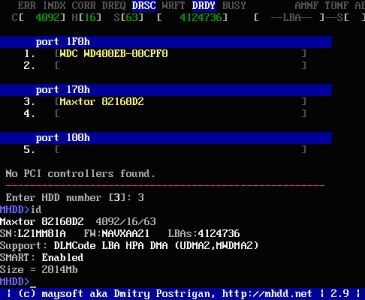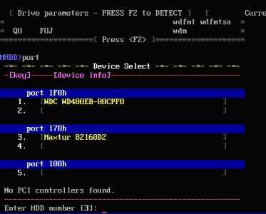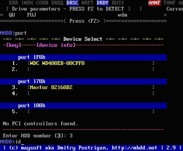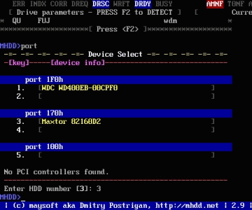 好了,現(xiàn)在看到有兩個硬盤,一個是西數(shù)40G,一個是邁拓2G。(說明:1、2是接在IDE1口上的主從硬盤,3、4是接在IDE2口上的主從硬盤,5是接在PC3000卡上的。如果我們要修的硬盤接在PC3000上,就會在這里顯示)下面是讓你選擇要修哪個硬盤,輸入3,回車;