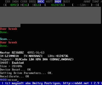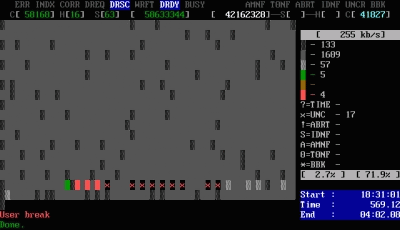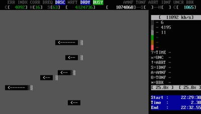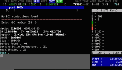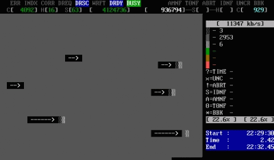 屏幕第一行的左半部分為為狀態(tài)寄存器,右半部分為錯誤寄存器;在屏幕第一行的中間(在BUSY和AMNF之間)有一段空白區(qū)域,如果硬盤被加了密碼,此處會顯示PWD;如果硬盤用HPA做了剪切,此處會顯示HPA;屏幕第二行的左半部分為當前硬盤的物理參數(shù)(虛擬的,當然不會真的有十六個磁頭),右半部分為當前正在掃描的位置;屏幕右下角為計時器,Start表示開始掃描的時間,Time表示已消耗的時間,End表示預計結束的時間,結束后會再顯示Time Count,表示總共耗費了多長的時間;在掃描時,每個長方塊代表255個扇區(qū)(在LBA模式下)或代表63個扇區(qū)(在CHS模式下);
