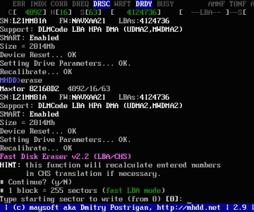 ERASE:快速擦除命令,在使用中我發(fā)現(xiàn)有低格和清零的功效,但此命令一點不影響硬盤壽命,有時對壞道和紅綠塊擦除能起到意想不到的作用。輸入命令,按回車;