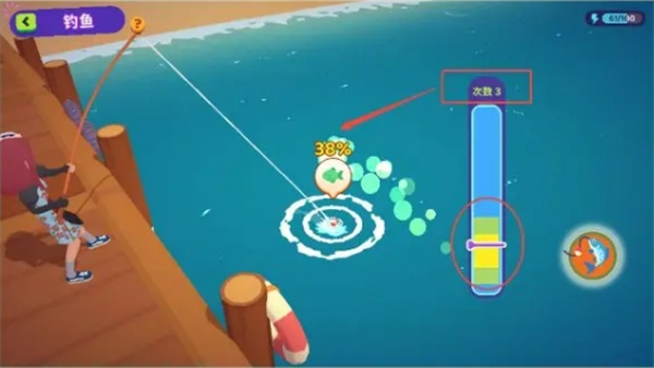 4、魚上鉤后注意觀察界面指針,當指針處于黃綠色區(qū)域時點擊釣魚按鈕增加釣魚進度,需在釣魚次數(shù)耗盡前使進度達到100%才能成功釣到魚。