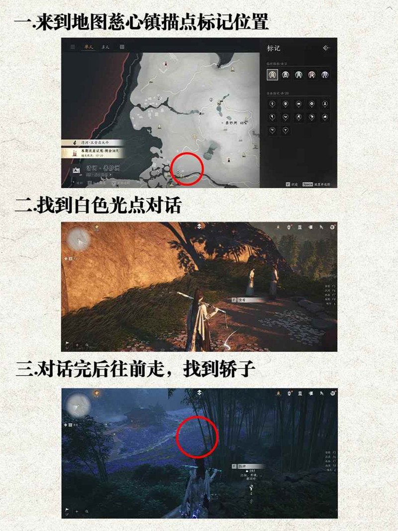 1、先到地圖慈心鎮(zhèn)的描點標(biāo)記位置,精準(zhǔn)找到白色光點并與之對話,再往前走找到轎子,隨后與花魁詳細(xì)對話,為后續(xù)高效刷取做好充足且必要的準(zhǔn)備工作。
