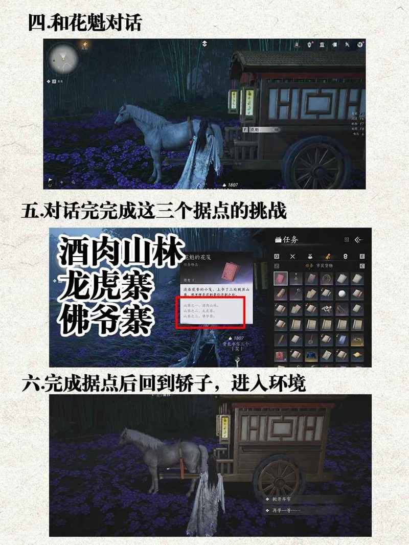 2、完成酒肉山林、龍虎寨、佛爺寨三個據(jù)點的挑戰(zhàn),這是刷取過程中必須完成的關(guān)鍵任務(wù)環(huán)節(jié),是后續(xù)操作的基礎(chǔ),絕對不可跳過,完成據(jù)點挑戰(zhàn)后回到轎子,進(jìn)入特定環(huán)境。