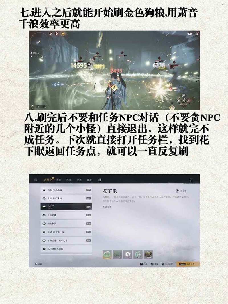3、刷完后不要和任務(wù)NPC對話直接選擇退出,下次從任務(wù)欄花下眠快速返回任務(wù)點即可反復(fù)刷取,及時使用蕭音千浪技能,能有效提高刷取金色狗糧的效率,大幅縮短獲取所需時間。