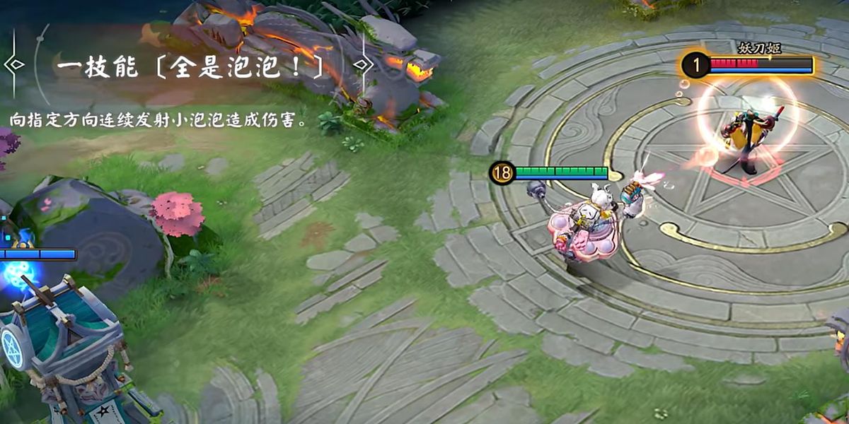 4、一技能全是泡泡,向指定方向連續(xù)發(fā)射小泡泡造成傷害,是蘭蘭主要的輸出技能之一,可用于消耗敵人血量。