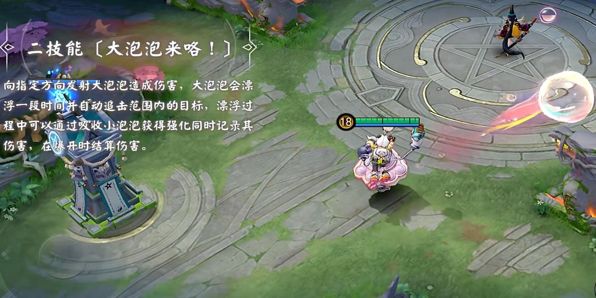 5、二技能大泡泡來(lái)咯,向指定方向發(fā)射大泡泡造成傷害,大泡泡會(huì)漂浮一段時(shí)間并自動(dòng)追擊范圍內(nèi)目標(biāo),漂浮過(guò)程中可吸收小泡泡強(qiáng)化并記錄傷害,爆開(kāi)時(shí)結(jié)算傷害。