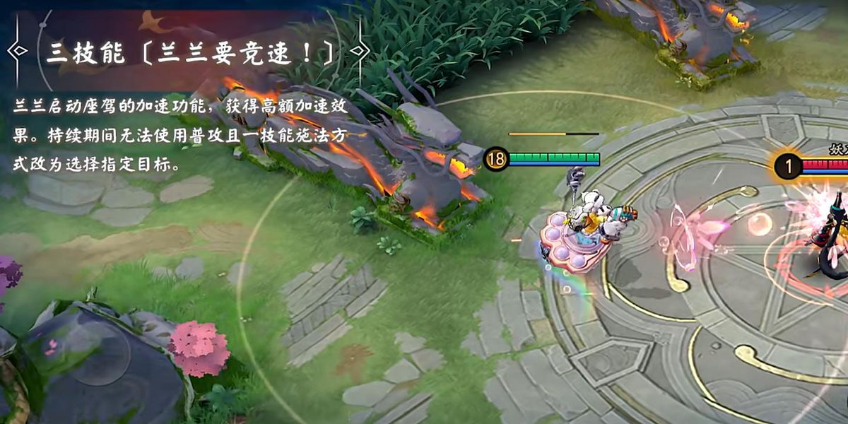 6、三技能蘭蘭要競(jìng)速,蘭蘭啟動(dòng)座駕加速功能,獲得高額加速效果,持續(xù)期間無(wú)法使用普攻且一技能施法方式改為選擇指定目標(biāo),可用于調(diào)整自身位置或追擊敵人。
