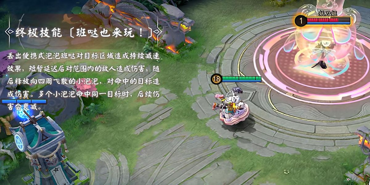 7、終極技能班噠也來(lái)玩,丟出泡泡班噠對(duì)目標(biāo)區(qū)域造成持續(xù)減速效果,延遲后對(duì)范圍內(nèi)敵人造成傷害,隨后釋放飛散的小泡泡,對(duì)命中目標(biāo)造成傷害,泡泡命中同一目標(biāo)時(shí)傷害衰減。